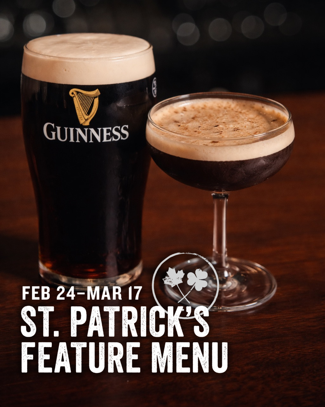 From Feb 24–March 17, 2026, enjoy Irish-inspired favourites like Irish nachos, Guinness chocolate cake, and a Guinness espresso martini.